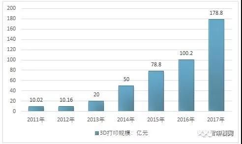 2016年我國3D打印行業(yè)市場規(guī)模達(dá)到了100.2億元,同比2015年的78.8億元增長了27.2%,2017年我國3D打印行業(yè)市場規(guī)模約178.8億元。