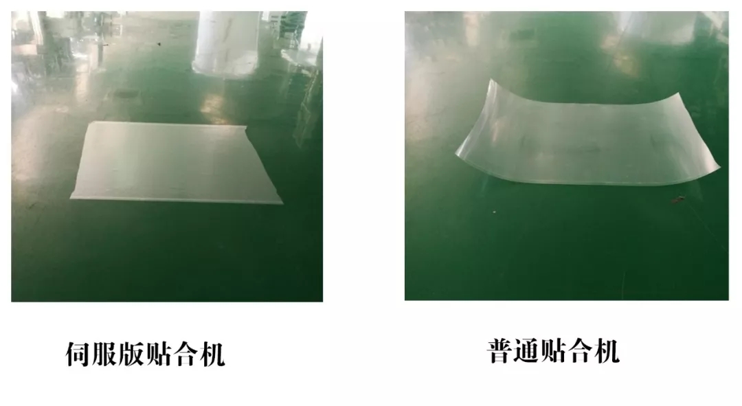 3、普通貼合機貼合張力控制造成貼合卷曲問題;伺服版貼合機自動控制張力狀態(tài)下,貼合無卷曲。